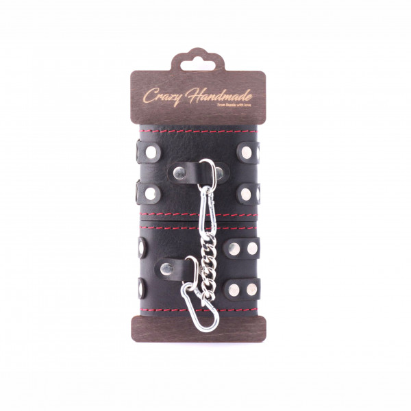 Выполнены оковы из натуральной кожи в черном цвете и декорированы красной строчкой и металлическими клепками