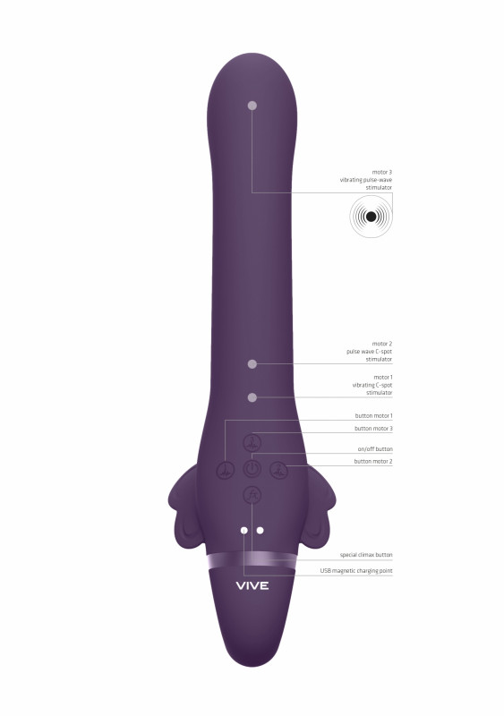 Безремневой страпон с двойной пульсацией и клиторальным стимулятором "Vive Satu" фиолетовый